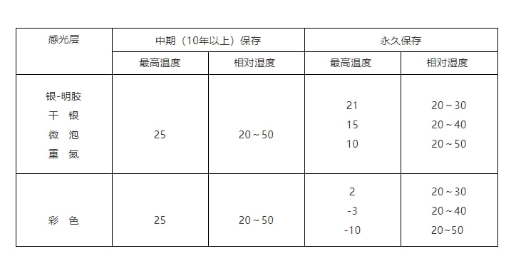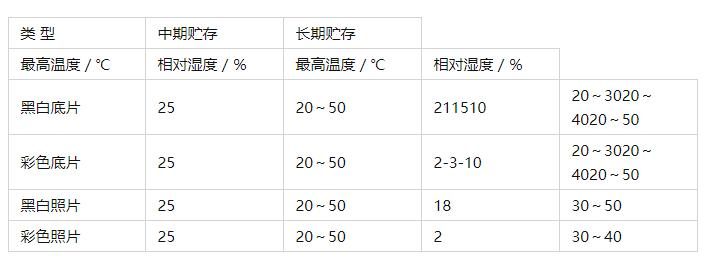注1:中期贮存是指胶片、照片在表中规定的温、湿度条件下至少能保存10年。长期贮存是指胶片、照片在表中规定的温、湿度条件下至少能保存100年。