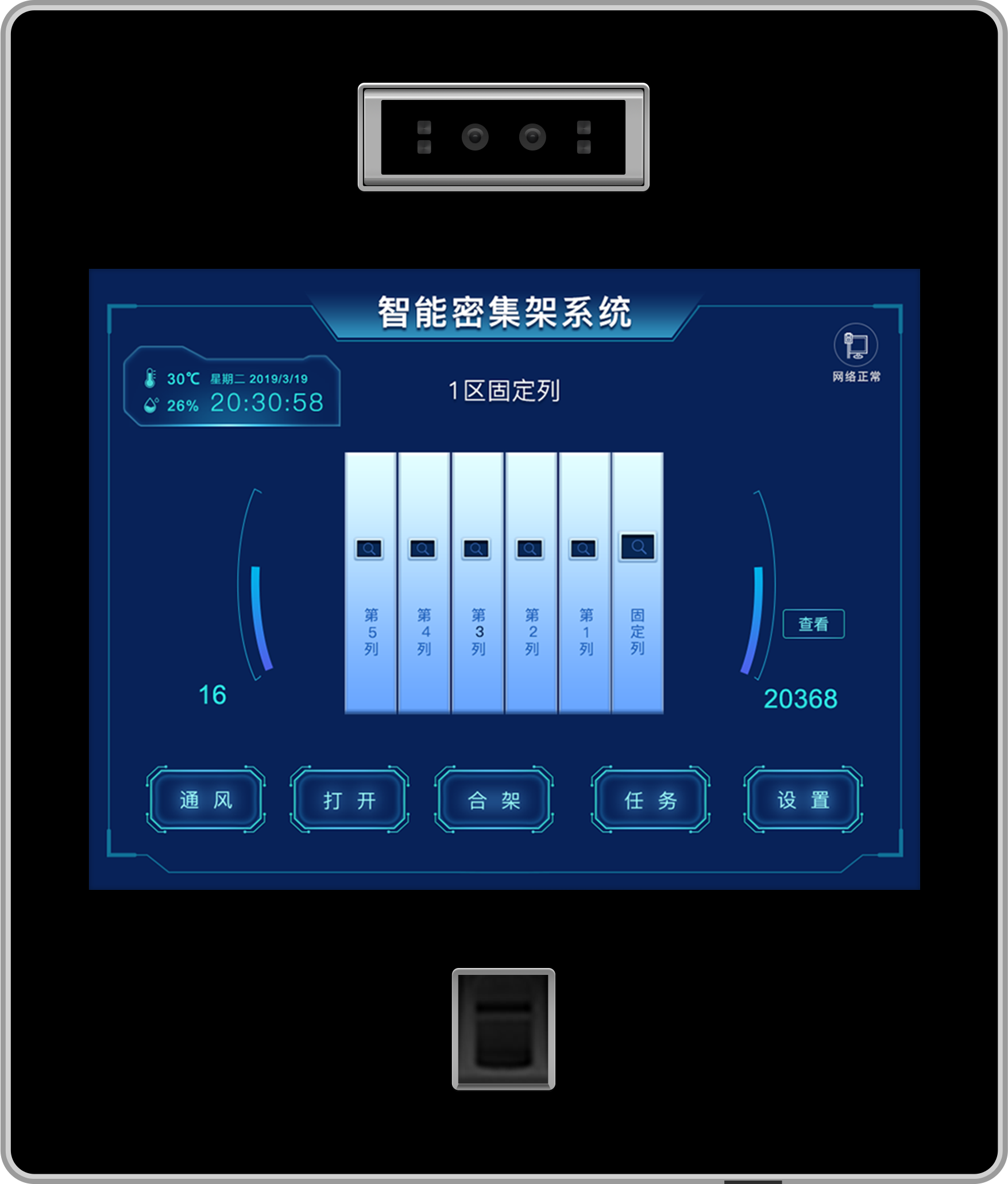 外观是影响用户体验感最直观的因素。智能控制器根据架体分为固定列控制器和移动列控制器,固定列控制器作为智能密集架的主控制器,其显示屏会比移动控制器更大。固定列控制器一般采用12寸彩色液晶高清电容触摸屏,移动列采用8寸彩色液晶触摸屏,具有方便直观、图像清晰、坚固耐用和节省空间等优点,使用者只需轻触显示屏上的图符或文字就能实现对密集架的移动操作和档案查询。