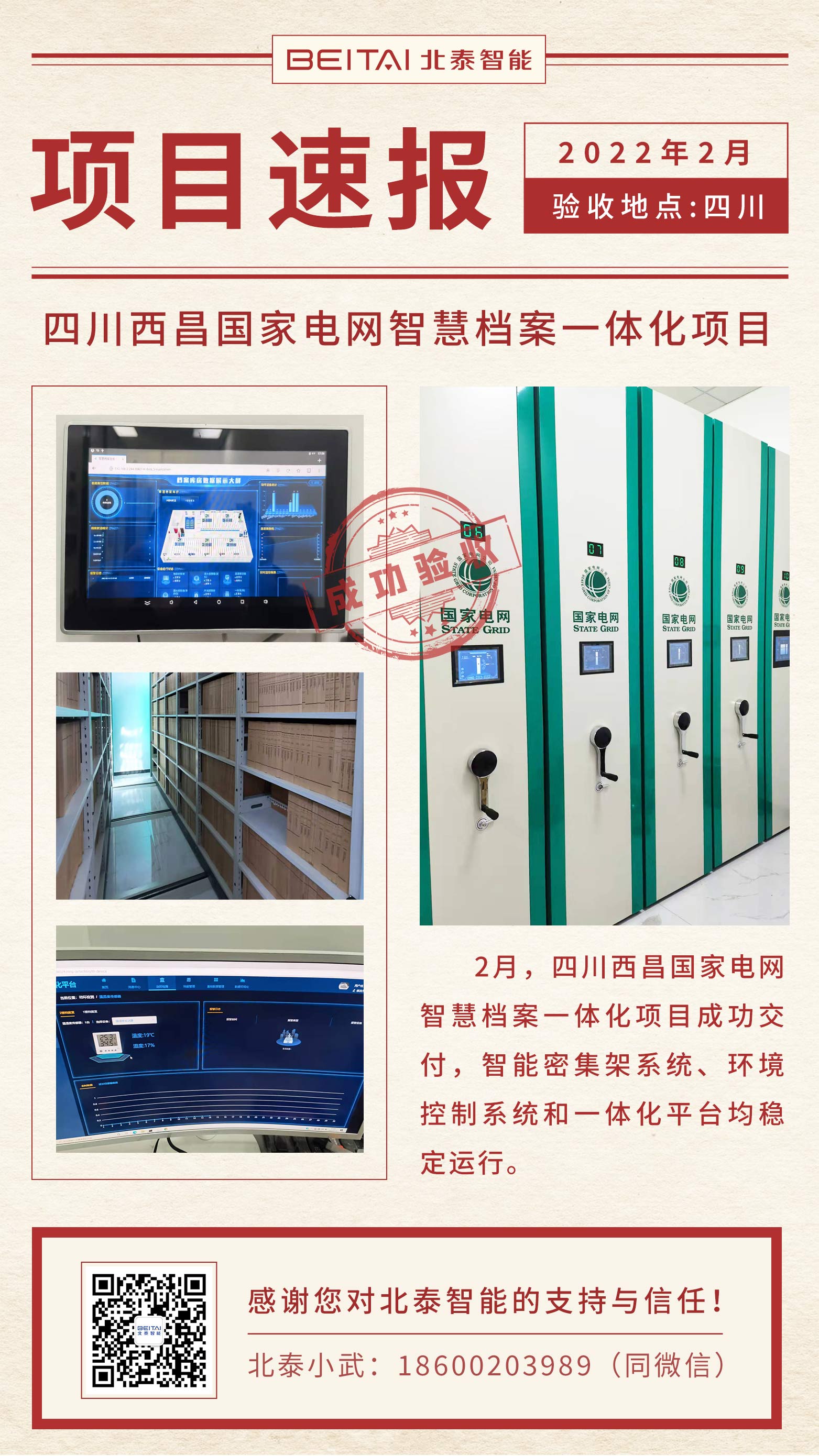 2022年02月,四川西昌国家电网智慧档案一体化项目成功交付,智能密集架系统、环境控制系统和一体化平台均稳定运行。